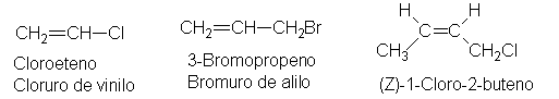 Un alqueno que contiene halógeno generalmente recibe el nombre de haloalqueno, esto es, un alqueno que contiene halógeno como cadena. Hay dos grupos no saturados tan comunes que se les da un nombre especial: vinilo , CH2 =CH-, y alilo , CH2 =CH-CH-CH2-.